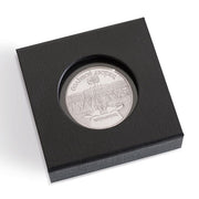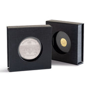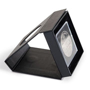 Tukevasta pahvista valmistettu musta kolikkokotelo QUADRUM-kapseleille. Kohokohta: katseluikkuna katselua varten ja telinetoiminto kolikon esittelyä varten. Sisäosa mustalla, veluurimaisella pinnalla. Huomaamaton magneettisuljin. Kapselit eivät sisälly. Ulkoinen koko: 71 x 71 x 19 mm. Myydään yksittäin.